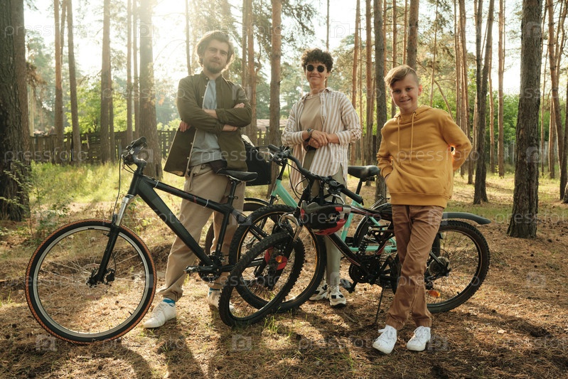 Молодая семья стоит у велосипедов на земле, покрытой иглами сосны