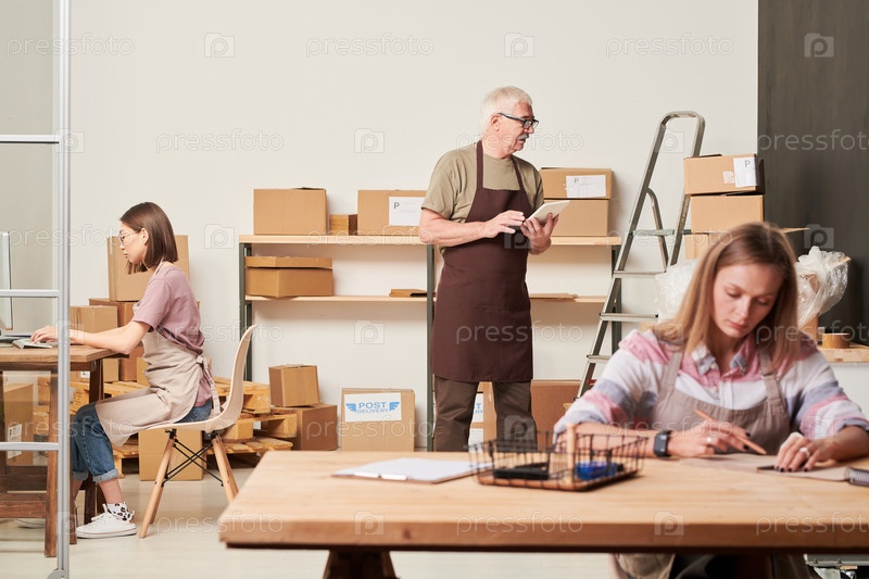 Загруженный старший сотрудник в фартуке, использующий приложение для планшетов и изучая этикетки на коробках, а молодые женщины работают с онлайн-заказами