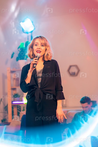 Красивая блондинка с вечерним макияжем, держащая микрофон у рта