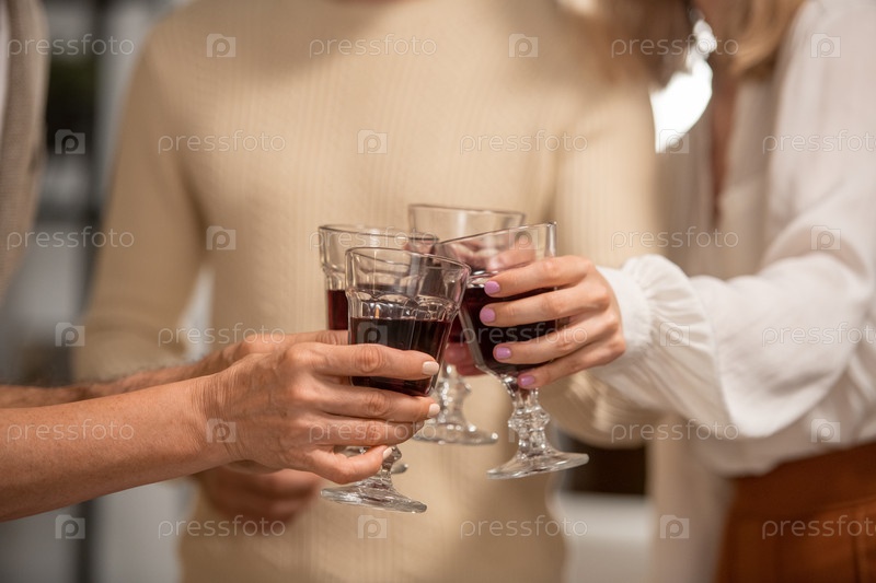 Руки четырёх членов семьи в повседневной одежде, звенящие со стаканами красного вина