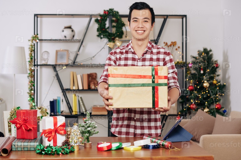Мужчина, держащий упакованный рождественский подарок