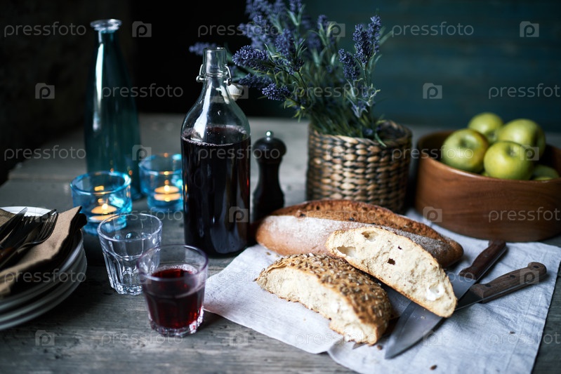 Домашнее вино в бутылке и стакане, свежий хлеб на салфетке, чаша с яблоками