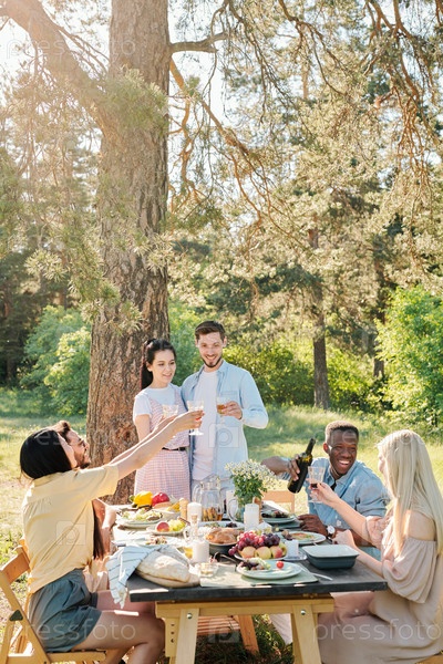 Три мультикультурные пары, соприкасающиеся с бокалами вина за подаваемым столом