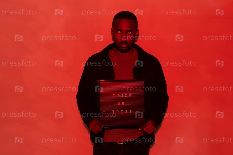 Портрет серьезного молодого человека с пугающими глазами, держащего баннер 'трик или сладость' в красном свете, концепция Хэллоуина