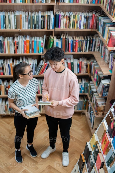 Два случайных подростка стоят в библиотеке колледжа среди полок с книгами