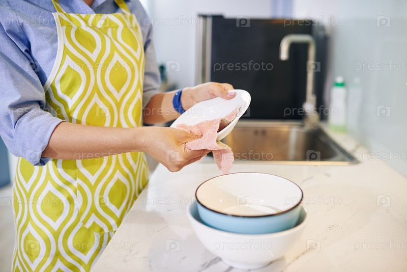 Домашняя хозяйка, стирающая чистые посуды