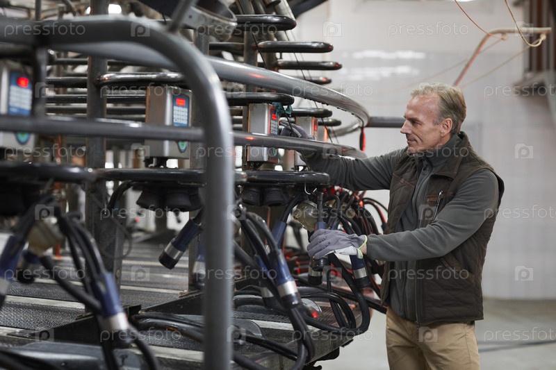 Зрелый работник устанавливает доярку на молочной ферме