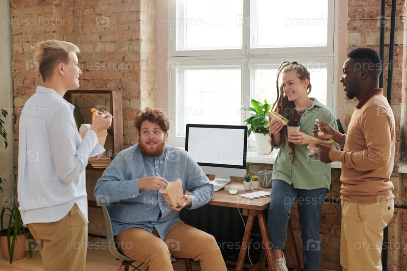 Группа позитивных молодых мультиэтнических коллег в обычных нарядах, обсуждающих проект во время обеденного перерыва в офисе