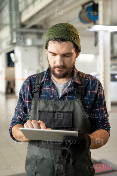 Молодой бородатый слесарь современного автосервиса использует цифровой планшет