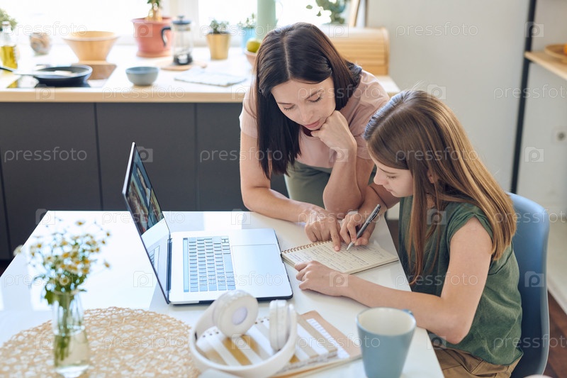 Молодая брюнетка-женщина в повседневной одежде, указывающая на записки своей дочери-подростка