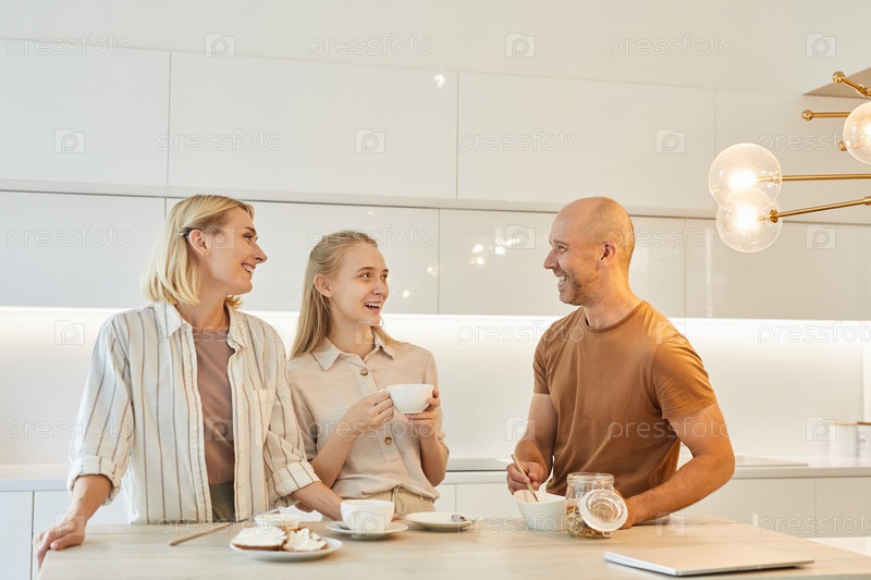 Семья наслаждается завтраком на современной кухне