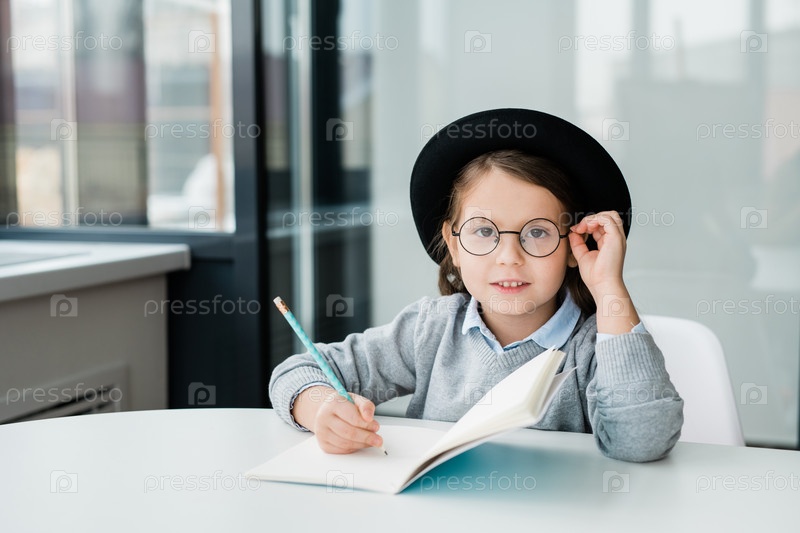 Очаровательная умная школьница в шляпе смотрит на тебя, делая заметки в копийке
