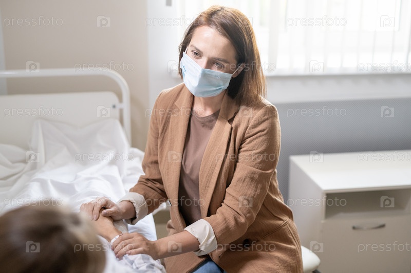 Молодая женщина в повседневной одежде и защитной маске поддерживает больного друга с коронавирусом