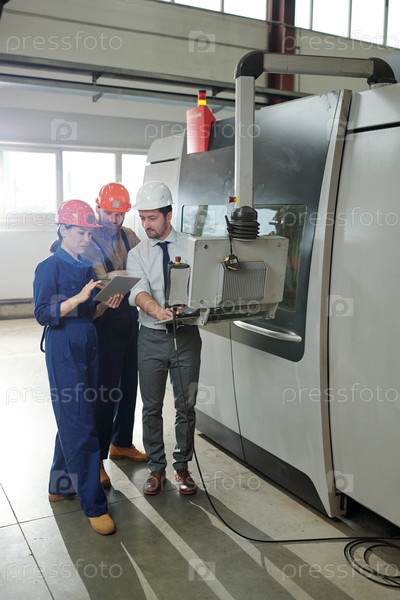 Команда молодых инженеров в области рабочей одежды, работающих на панели управления в мастерской