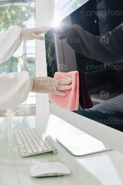 Техник, стирающий компьютерный экран