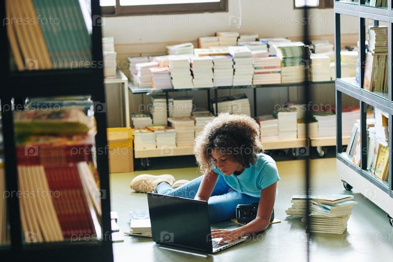Девушка, работающая на ноутбуке в библиотеке