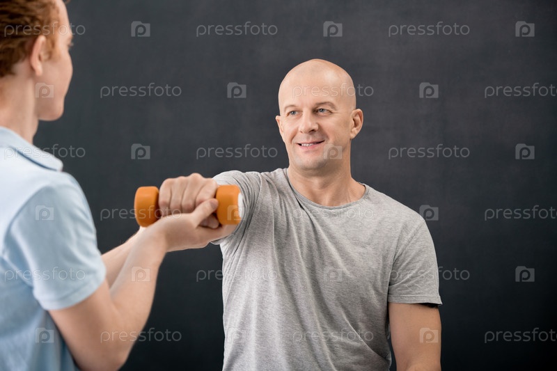 Профессиональный физиотерапевт помогает зрелому лысому мужчине поднимать и растягивать руку