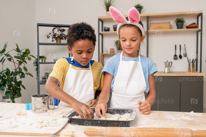 Дети качают тесто во время приготовления домашней выпечки