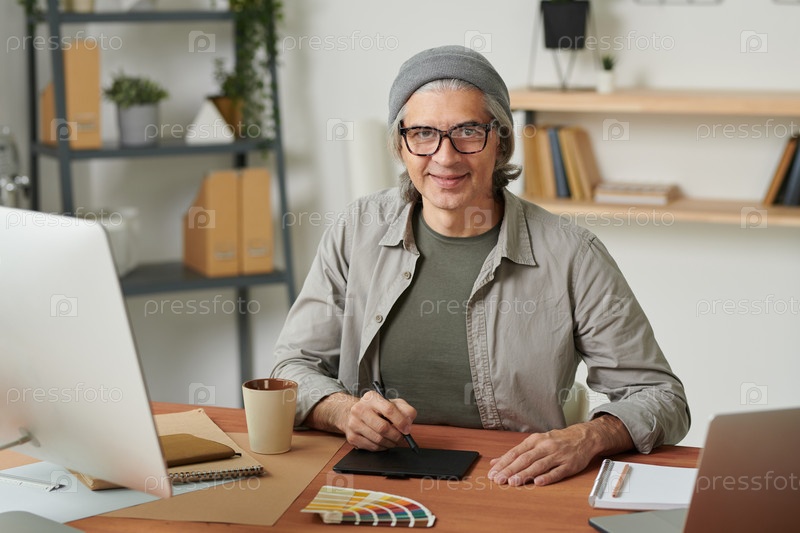 Портрет улыбающегося уверенного зрелого графического дизайнера, сидящего за столом и редактирующего дизайн с помощью блокнот