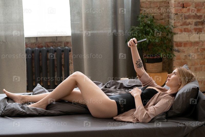 Молодая блондинка в черном нижнем белье и бежевом шелковом халате делает селфи в постели