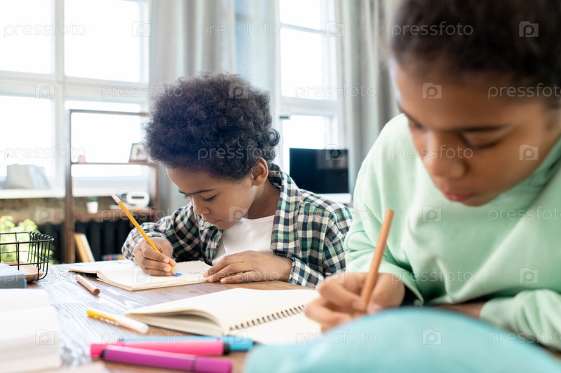 Милый мальчик из начальной школы в повседневной одежде и его сестра делают заметки в копиях