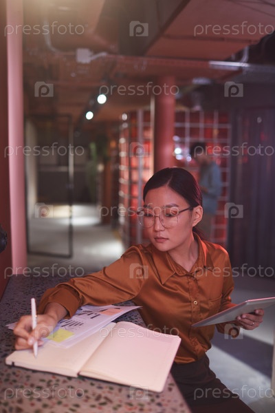 Элегантная азиатская бизнесвумен в футуристическом интерьере