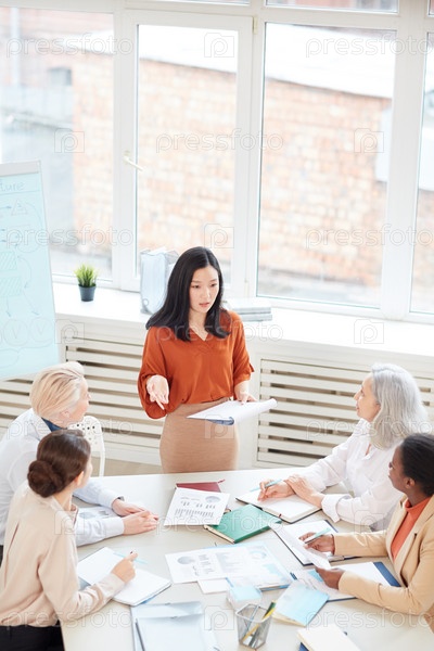 Успешная азиатская бизнесвумен ведущая встречу