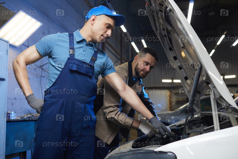 Два реставратора проверяют состояние автомобиля