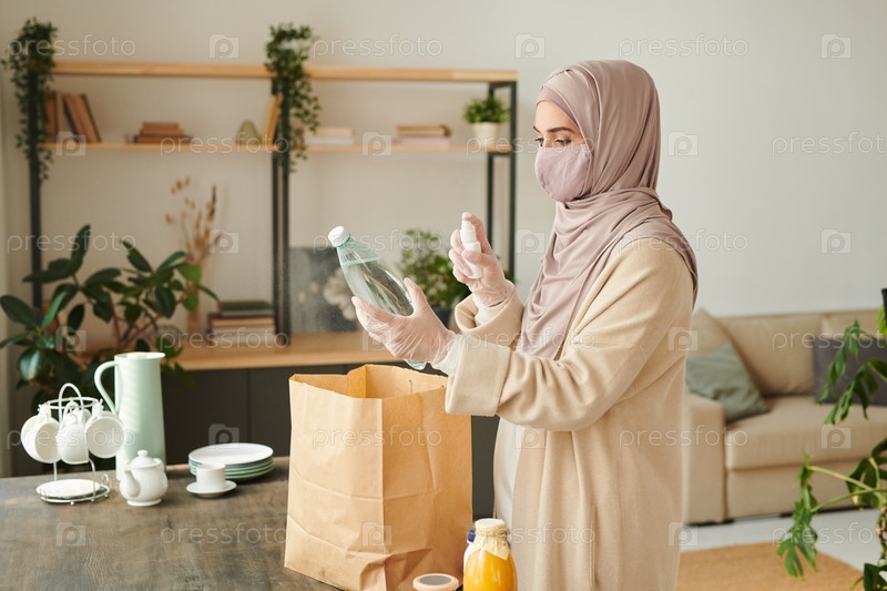 Мусульманка в хиджабе, защитная маска на лице и перчатки дезинфицируют товары дома после покупок