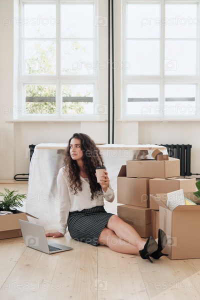 Задумчивая молодая бизнес-леди с кудрявыми волосами сидит на полу в новом офисе с перемещающимися коробками и пьет кофе, работая над проектом