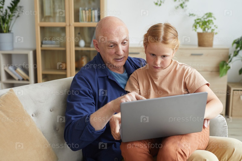 Старший мужчина использует ноутбук с внучкой
