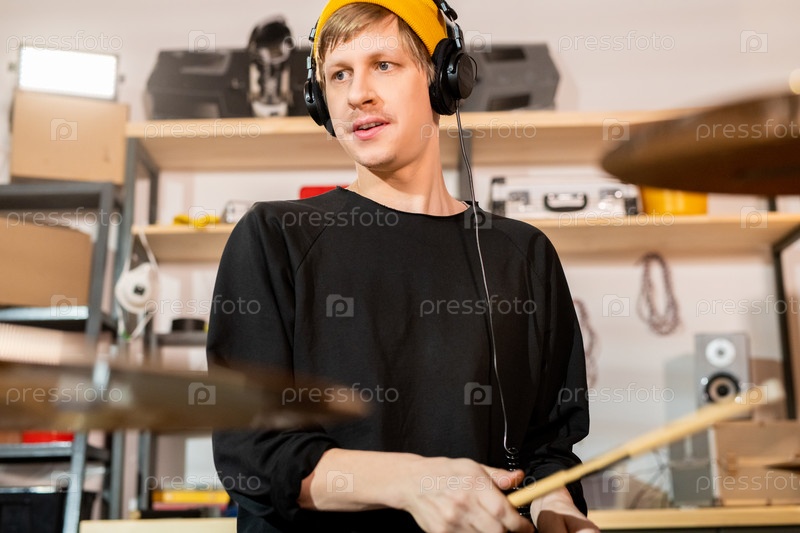 Современный молодой блондин мужской барабанщик в наушниках, ударяющий по кимвалам