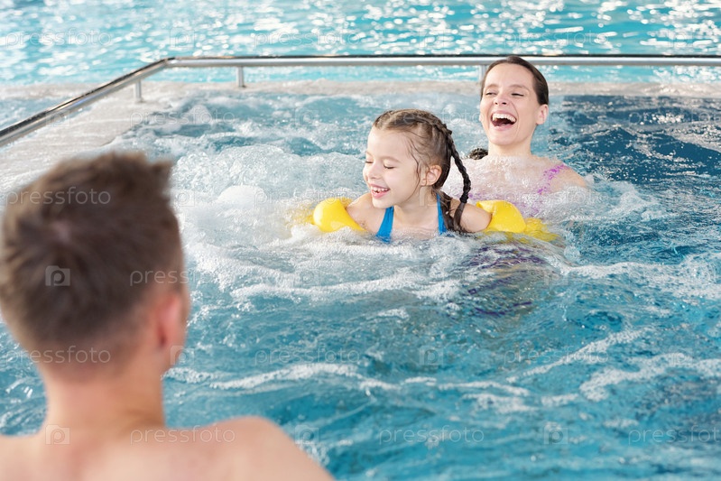 Молодая смеющаяся женщина и ее веселая дочка плавают в голубой воде