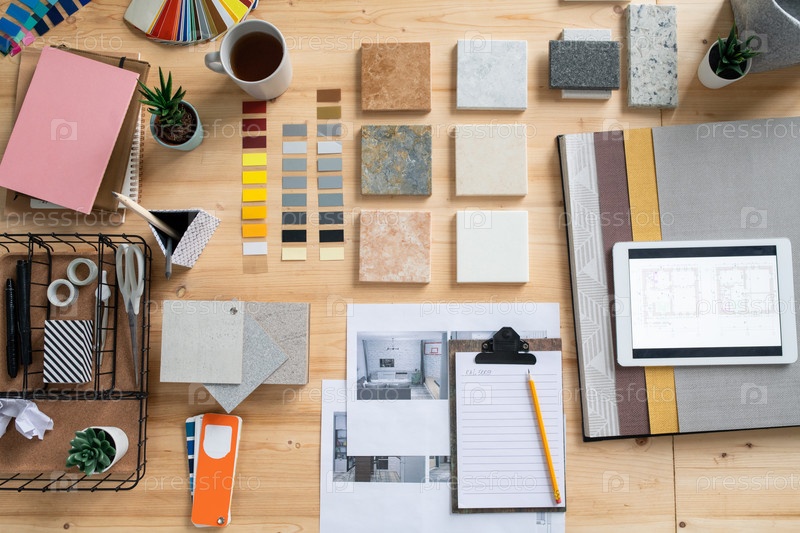 Вид сверху вниз образцов, фотографий, эскизов, палитров и других материалов