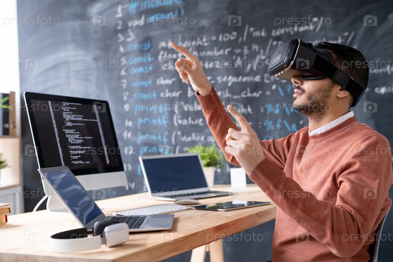 Молодой программист, тестирующий VR-гарнитуры или представляющий новое программное обеспечение