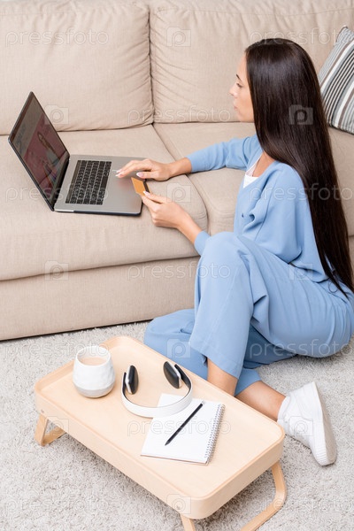 Молодая брюнетка в синей пижаме прокручивает товар в интернет-магазине