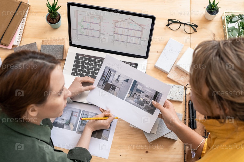 Две молодые креативные бизнес-женщины обсуждают фотографии домашнего интерьера