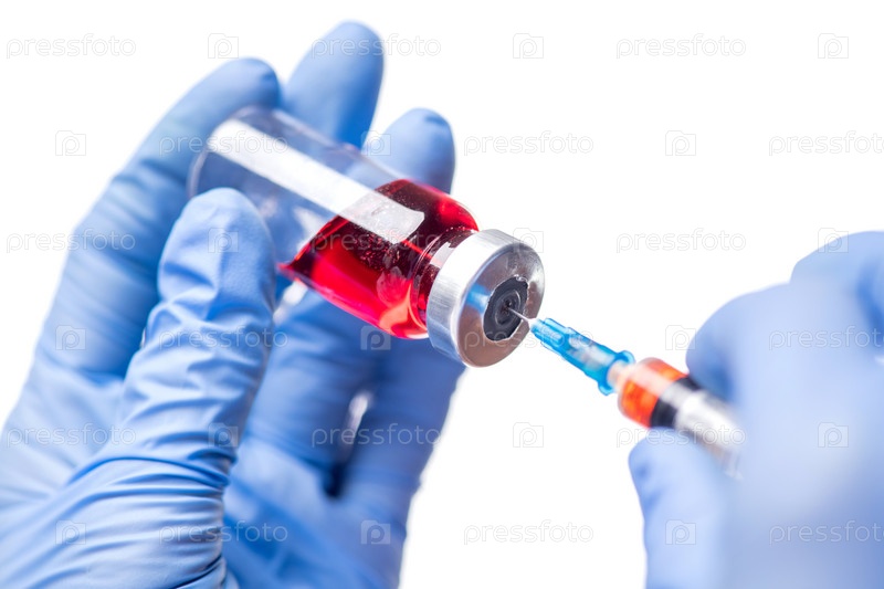 Заполнение шприца красным жидким лекарством
