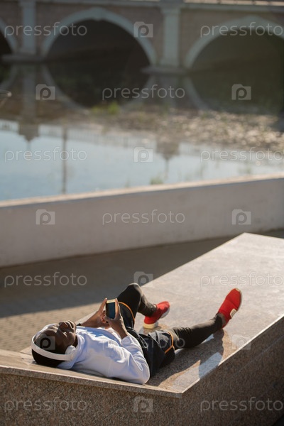 Молодой расслабленный африканский мужчина в спортивной одежде и белых наушниках лежит на берегу реки