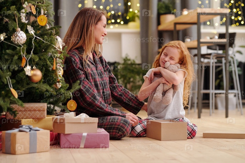 Маленькая девочка обнимает плюшевого медведя, сидя на полу рядом с матерью