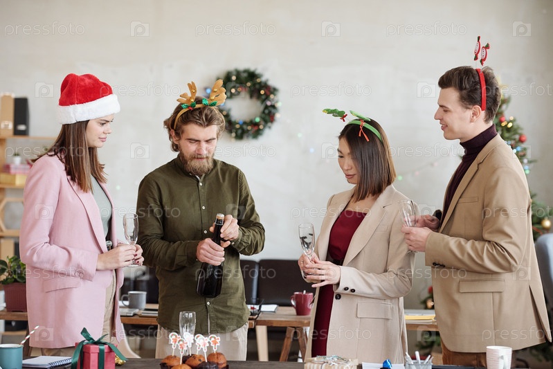 Группа молодых дружелюбных менеджеров в рождественских головных повязках собирается выпить шампанского