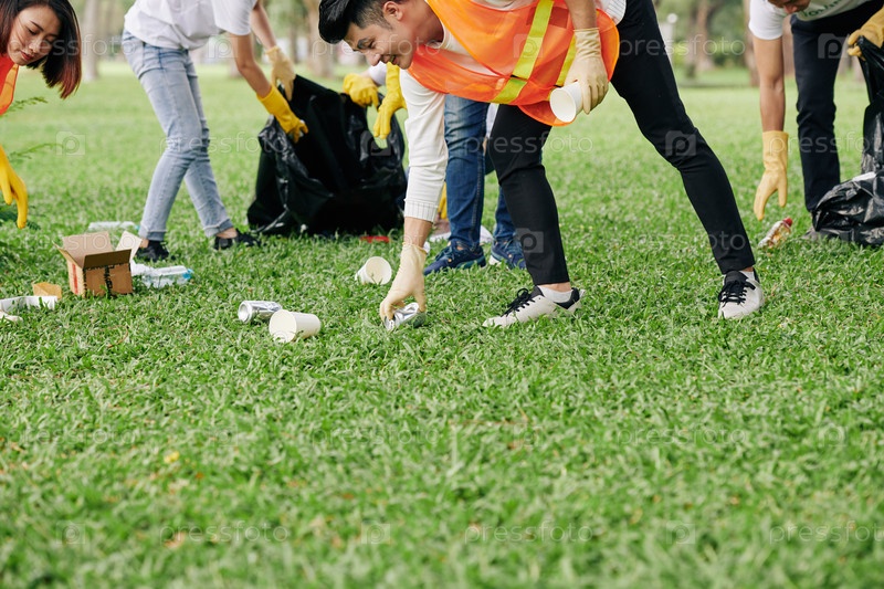 Люди собирают мусор в парке