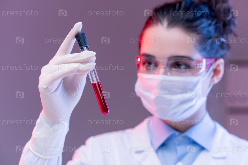 Молодая женщина-учёный смотрит на красное жидкое вещество в флаконе в лаборатории