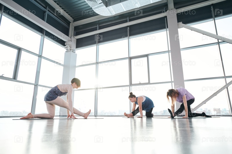 Группа молодых женщин, держащих одно колено на подстилке и растягивающих ноги вперед