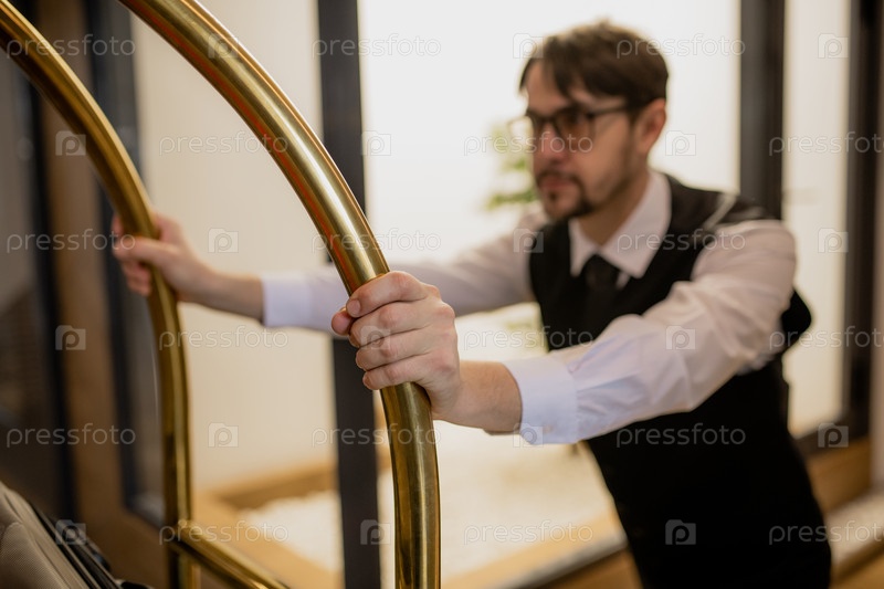 Рука портье, держащейся за ручки во время толчка тележки и подбора багажа