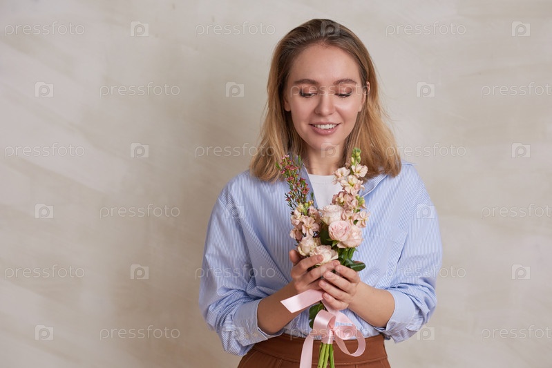 Портретная фотография привлекательной женщины, держащей букет цветов и смотрящей на него с удовольствием, copy space
