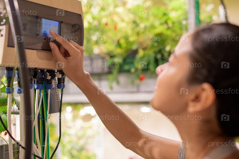 Молодая современная фермерка прикасается к маленькому дисплею на панели управления