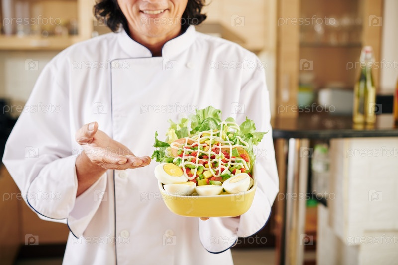 Шеф-повар показывает вкусный салат