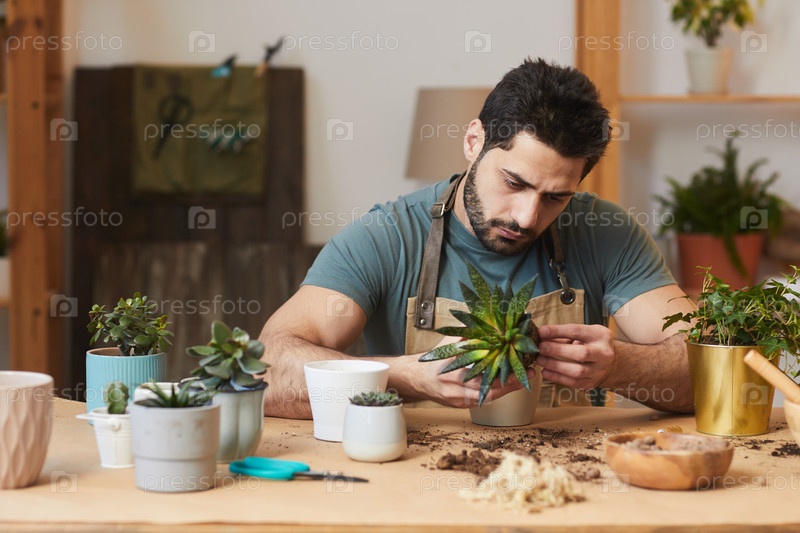 Красивый мужчина сажает растения в помещении