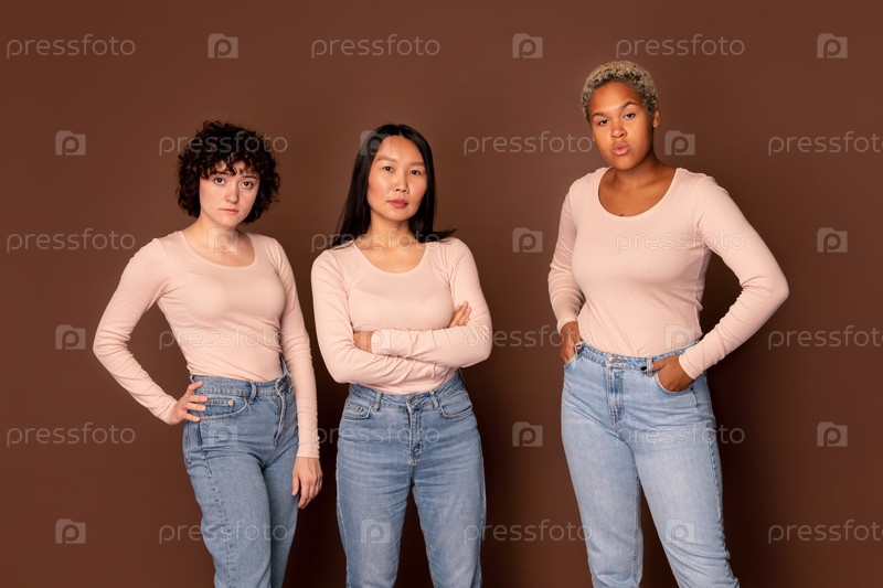 Молодые межкультурные женщины в белых пуловерах и синих джинсах стоят в очереди